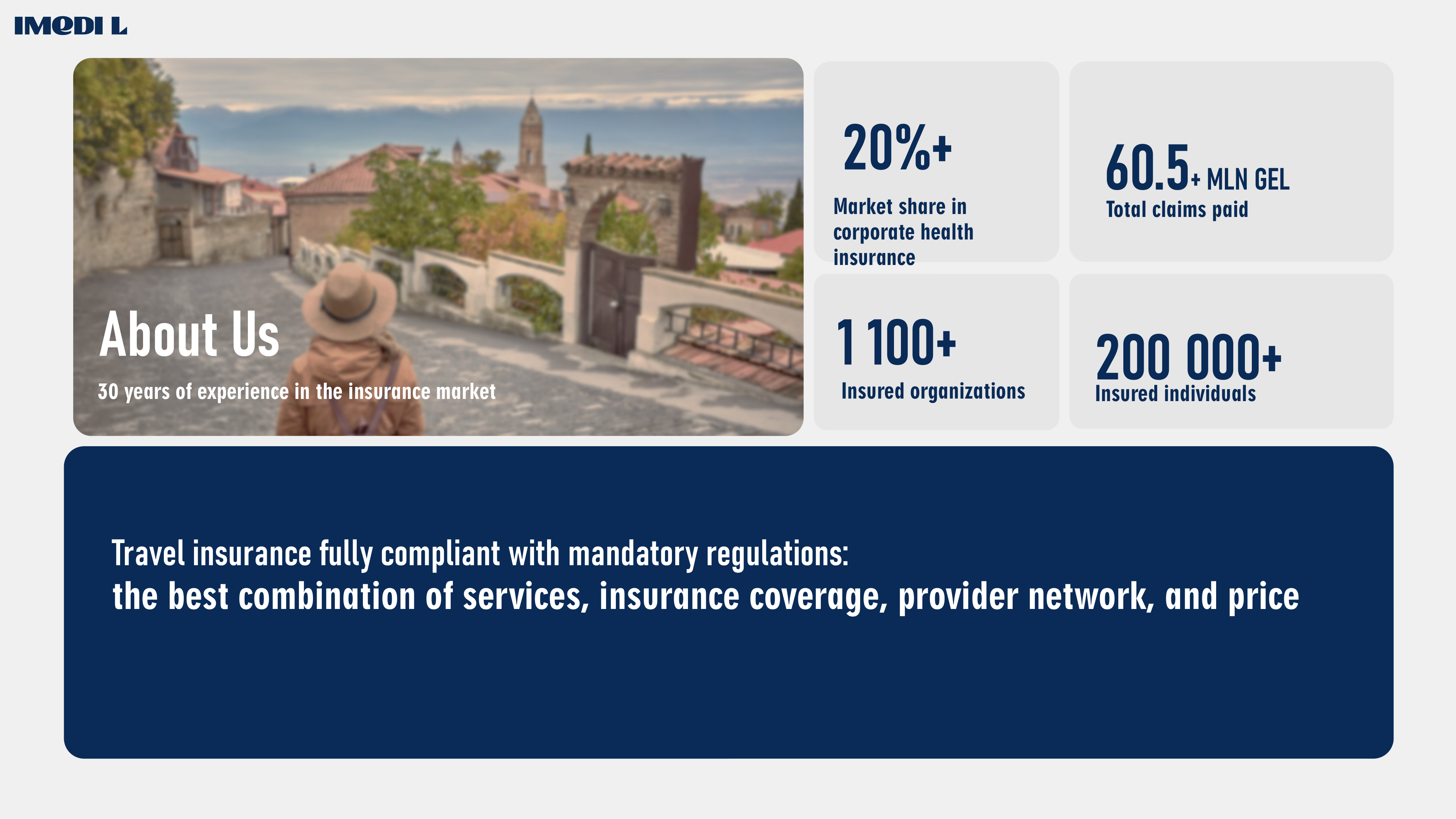 With over 30 years of experience, Imedi L is a leading insurance provider in Georgia, offering health, auto, travel, and property insurance. The company delivers flexible, tailored solutions designed to meet the needs of individuals, businesses, and international visitors, providing reliable protection and trusted service across Georgia.
